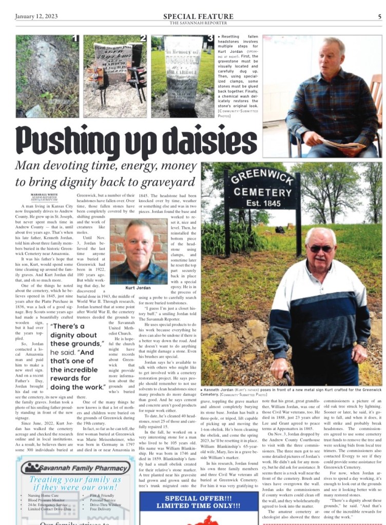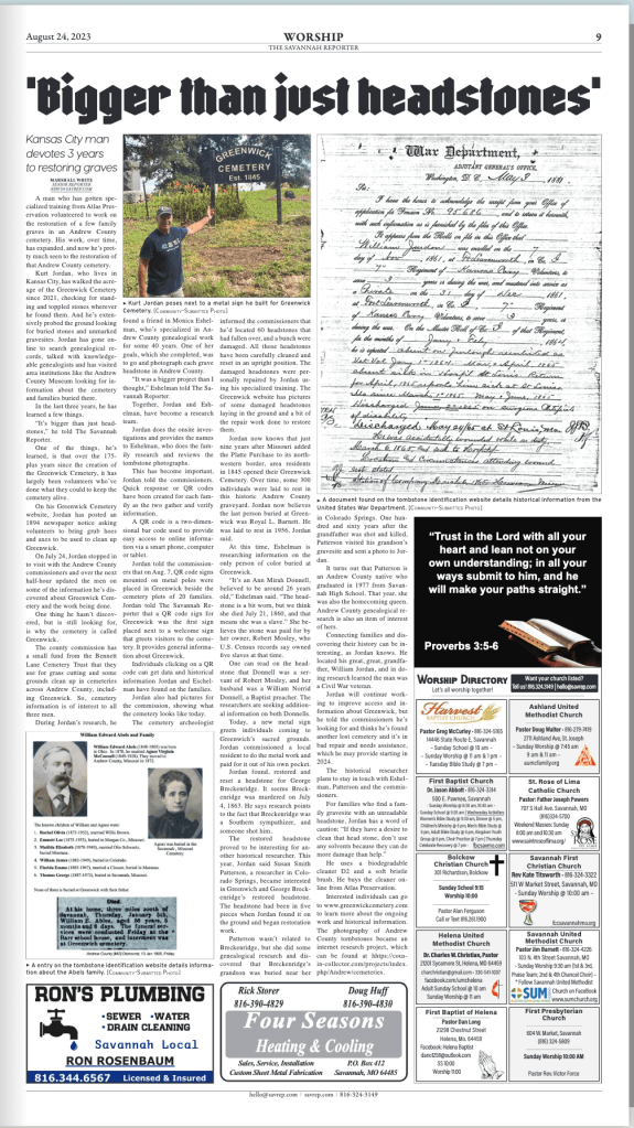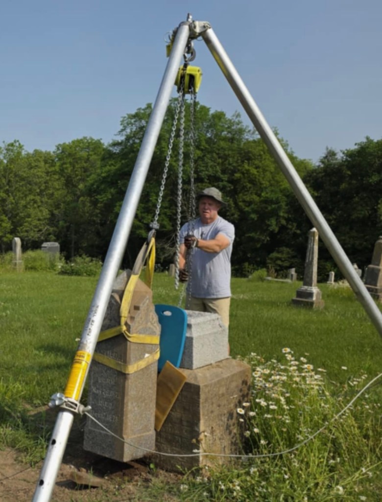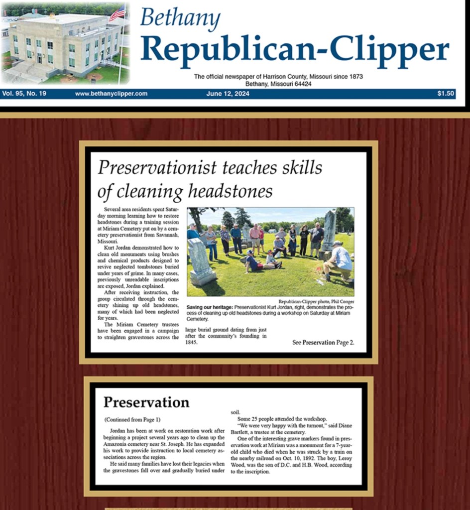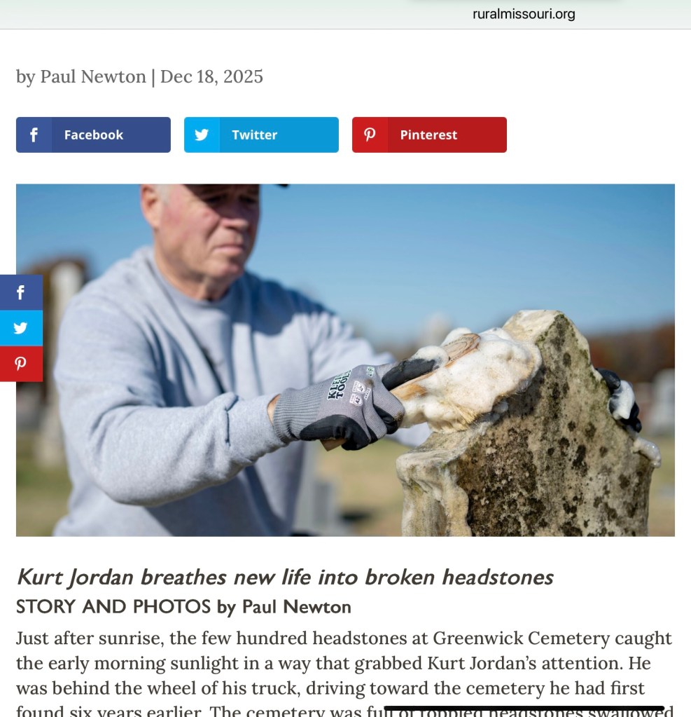 I stumbled into cemetery preservation work quite by accident when I repaired the marker for my 2X Great grandfather, William Jordan, at the Greenwick Cemetery located in Andrew County, MO. There was no turning back at that point. I completed field training on the proper methods of repair, including “do no harm”. Thus far, I have recovered, restored and cleaned hundreds of monuments….all completely free of charge.